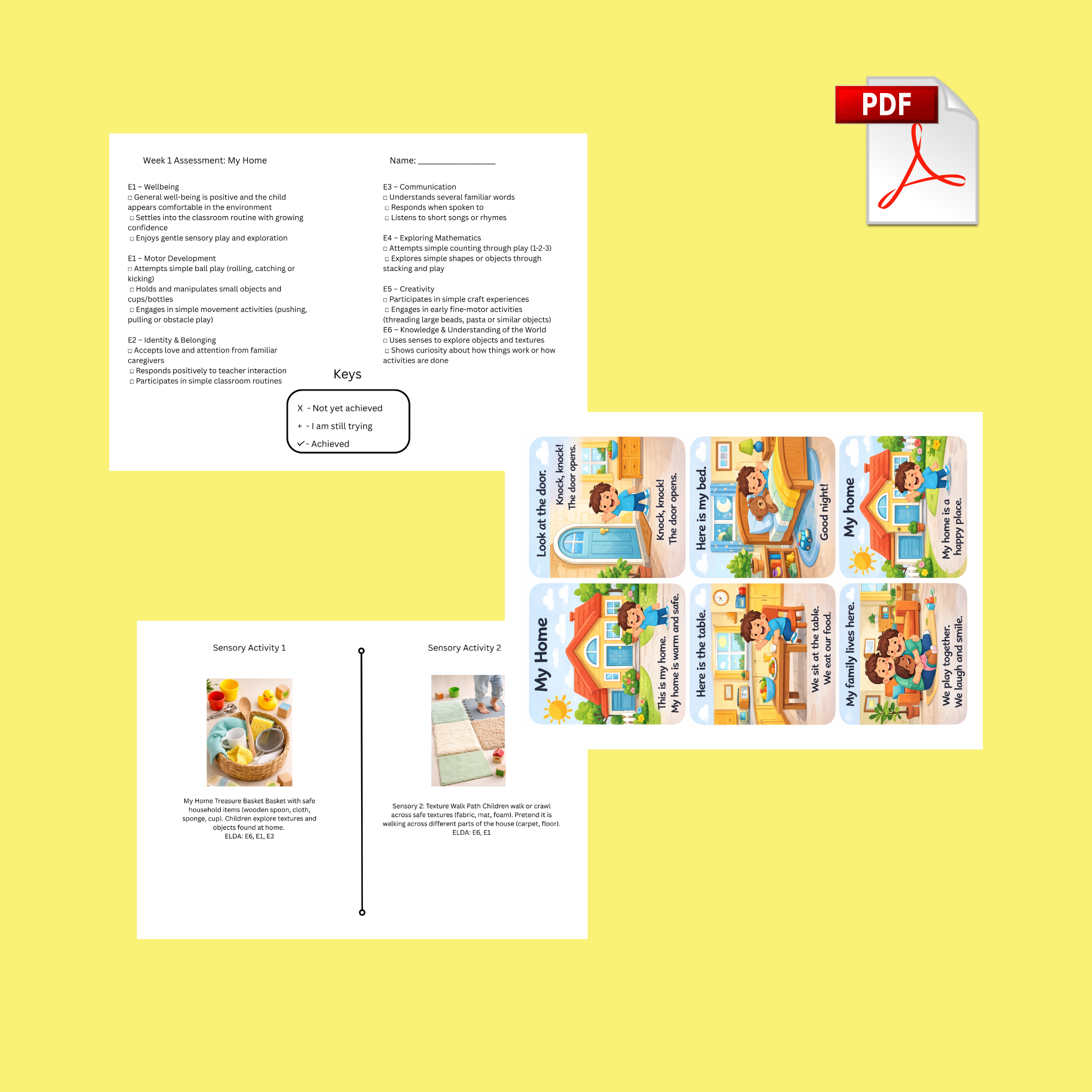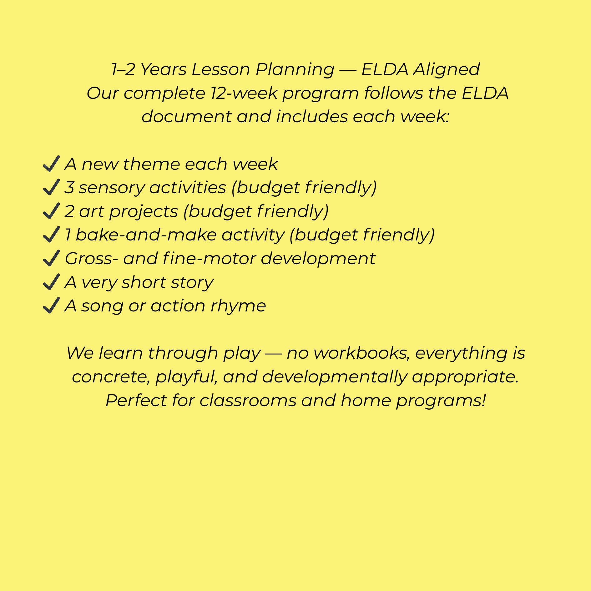 This complete 12-week toddler program is designed for 1–2 year olds and follows the ELDA Early Learning Development Areas, making it perfect for preschools, daycares, and home learning environments.