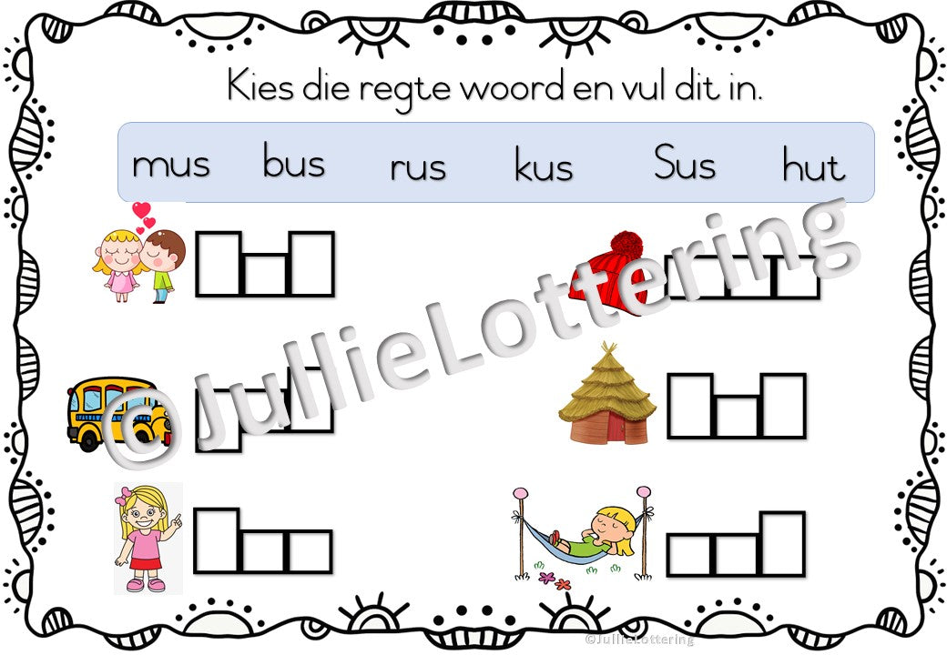 Hierdie boekie is vir die u-letter/klank. Dit sluit in natrek, potloodbeheer, soek die klank, inkleur, klank en lees van eenvoudige woorde en sinne. Die boekie is 15 bladsye in totaal.